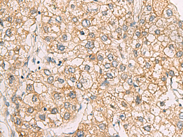 The image is immunohistochemistry of paraffin-embedded Human liver cancer tissue using P13080(CHST2 Antibody) at dilution 1/30. (Original magnification: ×200) |