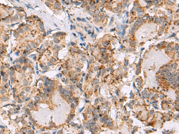 The image is immunohistochemistry of paraffin-embedded Human thyroid cancer tissue using P03608(CIB2 Antibody) at dilution 1/50. (Original magnification: ×200) |