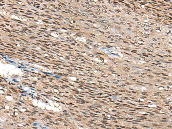 The image is immunohistochemistry of paraffin-embedded Human esophagus cancer tissue using P13085(CITED1 Antibody) at dilution 1/45. (Original magnification: ×200) |