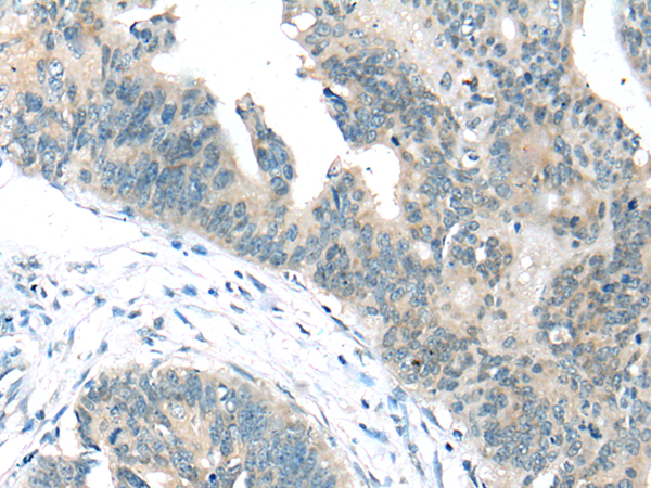 The image is immunohistochemistry of paraffin-embedded Human colorectal cancer tissue using P06198(CITED1 Antibody) at dilution 1/25. (Original magnification: ×200) |