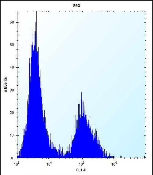 CLDN2 Antibody (C-term Y195) (Cat. #P31122) flow cytometric analysis of 293 cells (right histogram) compared to a negative control cell (left histogram).FITC-conjugated goat-anti-rabbit secondary antibodies were used for the analysis. |
