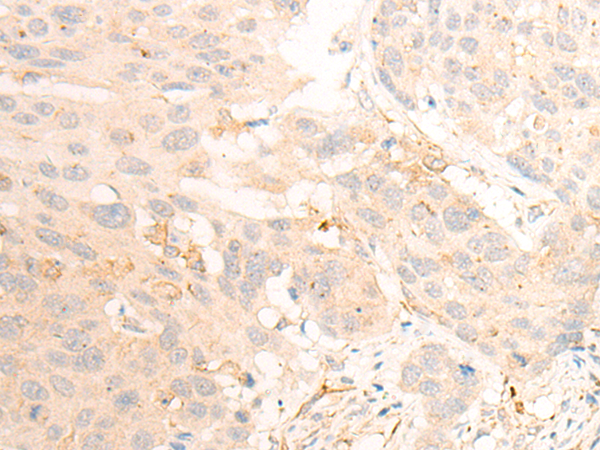 The image is immunohistochemistry of paraffin-embedded Human esophagus cancer tissue using P13200(CLEC12A Antibody) at dilution 1/20. (Original magnification: ×200) |