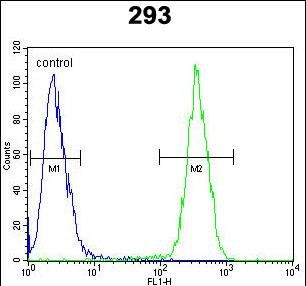 CLPX Antibody (C-term) (Cat. #P30846) flow cytometric analysis of 293 cells (right histogram) compared to a negative control cell (left histogram).FITC-conjugated goat-anti-rabbit secondary antibodies were used for the analysis. |
