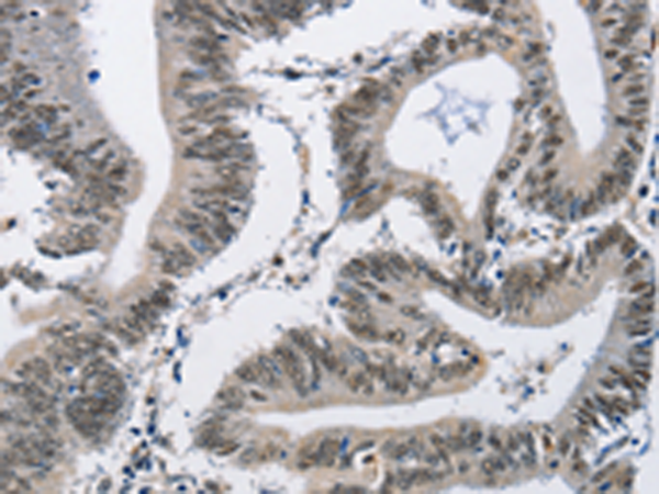 The image is immunohistochemistry of paraffin-embedded Human colon cancer tissue using P07199(CMTM2 Antibody) at dilution 1/60. (Original magnification: ×200) |