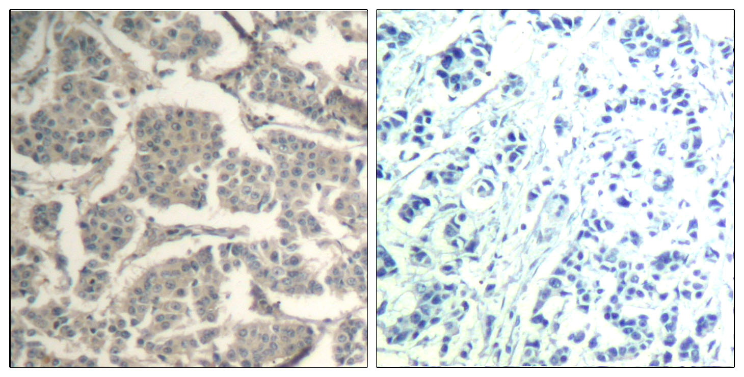 Immunohistochemistry analysis of paraffin-embedded Human breast carcinoma tissue using coflin1/cofilin2 (Ab88) antibody (left) or the same antibody preincubated with blocking peptide (right).High-pressure and temperature Sodium Citrate pH 6.0 was used for antigen retrieval. |