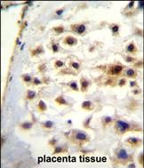 COL13A1 Antibody (N-term) (Cat. #P31007)immunohistochemistry analysis in formalin fixed and paraffin embedded human placenta tissue followed by peroxidase conjugation of the secondary antibody and DAB staining.This data demonstrates the use of COL13A1 Antibody (N-term) for immunohistochemistry. Clinical relevance has not been evaluated. |