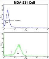 Flow cytometric analysis of MDA-231 cells using COLEC11 Antibody (N-term)(bottom histogram) compared to a negative control cell (top histogram). FITC-conjugated goat-anti-rabbit secondary antibodies were used for the analysis. |