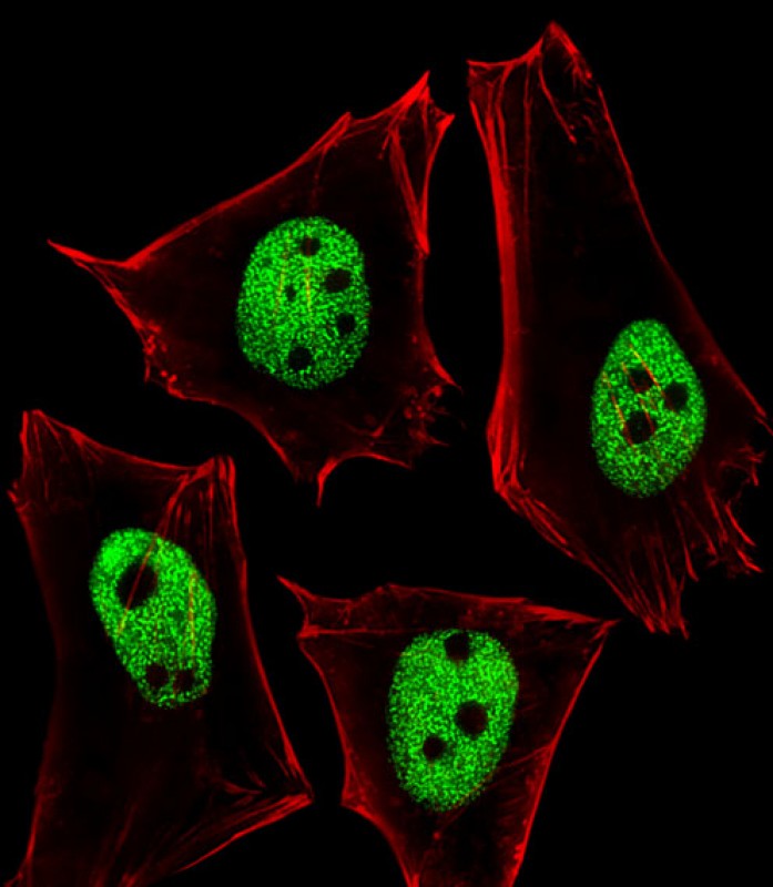 Fluorescent image of Hela cells stained with COPS2 Antibody (N-term)(Cat#P32786). P32786 was diluted at 1:25 dilution. An Alexa Fluor 488-conjugated goat anti-rabbit lgG at 1:400 dilution was used as the secondary antibody (green). Cytoplasmic actin was counterstained with Alexa Fluor® 555 conjugated with Phalloidin (red). |