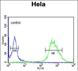 CP054 Antibody (C-term) (Cat. #P30562) flow cytometric analysis of Hela cells (right histogram) compared to a negative control cell (left histogram).FITC-conjugated goat-anti-rabbit secondary antibodies were used for the analysis. |