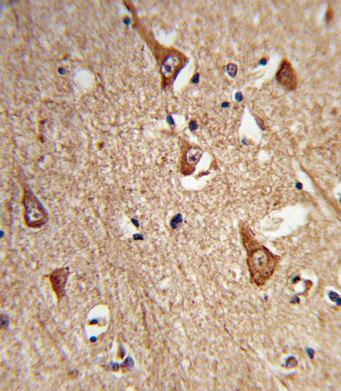 Formalin-fixed and paraffin-embedded human brain tissue reacted with CPLX1 Antibody (Center), which was peroxidase-conjugated to the secondary antibody, followed by DAB staining. This data demonstrates the use of this antibody for immunohistochemistry; clinical relevance has not been evaluated. |