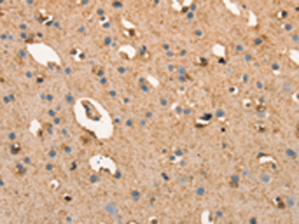 The image is immunohistochemistry of paraffin-embedded Human brain tissue using P11681(CRELD1 Antibody) at dilution 1/40. (Original magnification: ×200) |