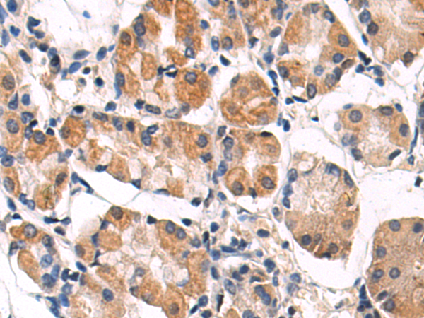 The image is immunohistochemistry of paraffin-embedded Human gastric cancer tissue using P02736(CSF1 Antibody) at dilution 1/80. (Original magnification: ×200) |