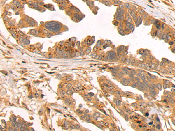 The image is immunohistochemistry of paraffin-embedded Human colorectal cancer tissue using P05910(CSF1 Antibody) at dilution 1/40. (Original magnification: ×200) |