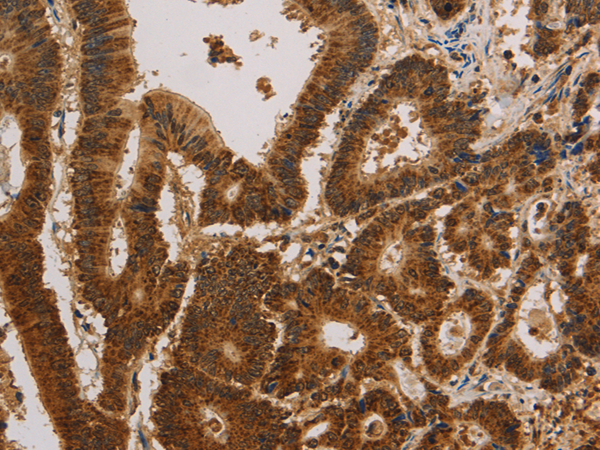 The image is immunohistochemistry of paraffin-embedded Human colon cancer tissue using P03817(CSNK2B Antibody) at dilution 1/30. (Original magnification: ×200) |