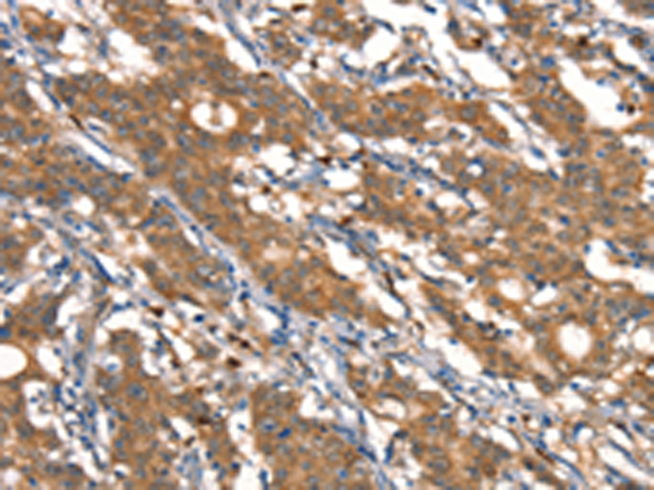The image is immunohistochemistry of paraffin-embedded Human gastric cancer tissue using P11698(CSTB Antibody) at dilution 1/30. (Original magnification: ×200) |