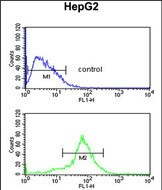 CT054 Antibody (Center) (Cat. #P30650) flow cytometric analysis of HepG2 cells (bottom histogram) compared to a negative control cell (top histogram).FITC-conjugated goat-anti-rabbit secondary antibodies were used for the analysis. |