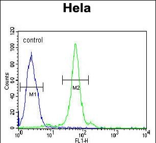 CTDSPL Antibody (N-term) (Cat. #P33382) flow cytometric analysis of Hela cells (right histogram) compared to a negative control cell (left histogram).FITC-conjugated goat-anti-rabbit secondary antibodies were used for the analysis. |