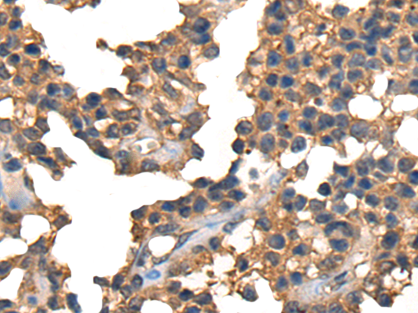 The image is immunohistochemistry of paraffin-embedded Human ovarian cancer tissue using P03843(CTLA4 Antibody) at dilution 1/20. (Original magnification: ×200) |