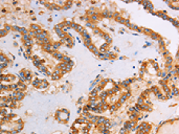 The image is immunohistochemistry of paraffin-embedded Human thyroid cancer tissue using P07160(CTNNA1 Antibody) at dilution 1/15. (Original magnification: ×200) |