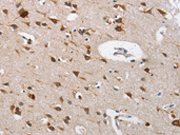 The image is immunohistochemistry of paraffin-embedded Human brain tissue using P07166(CTSL Antibody) at dilution 1/40. (Original magnification: ×200) |