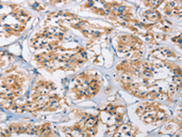 The image is immunohistochemistry of paraffin-embedded Human thyroid cancer tissue using P07166(CTSL Antibody) at dilution 1/40. (Original magnification: ×200) |