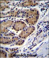 CTSO Antibody (N-term) (Cat. #P31155)immunohistochemistry analysis in formalin fixed and paraffin embedded human stomach tissue followed by peroxidase conjugation of the secondary antibody and DAB staining.This data demonstrates the use of CTSO Antibody (N-term) for immunohistochemistry. Clinical relevance has not been evaluated. |