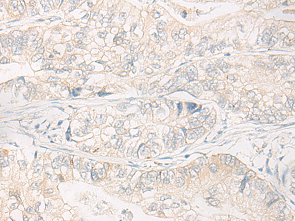 The image is immunohistochemistry of paraffin-embedded Human gastric cancer tissue using P13226(CYP2C8 Antibody) at dilution 1/20. (Original magnification: ×200) |