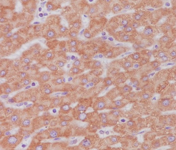 Immunohistochemistry analysis of paraffin-embedded Human liver using Cytochrome C antibody.High-pressure and temperature Sodium Citrate pH 6.0 was used for antigen retrieval. |