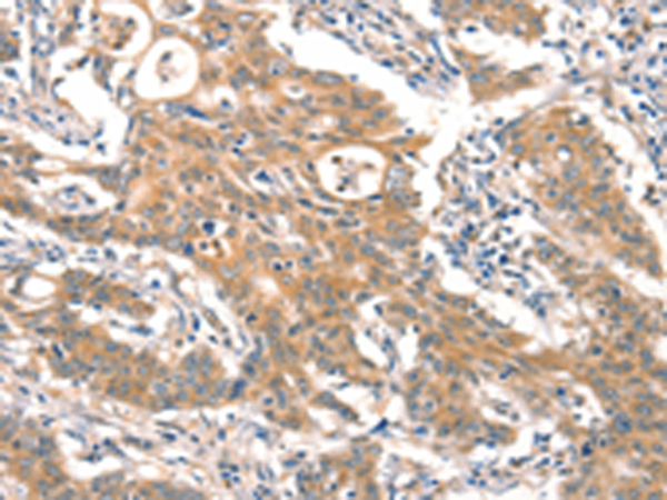 The image is immunohistochemistry of paraffin-embedded Human gastric cancer tissue using P11702(DAB2IP Antibody) at dilution 1/20. (Original magnification: ×200) |