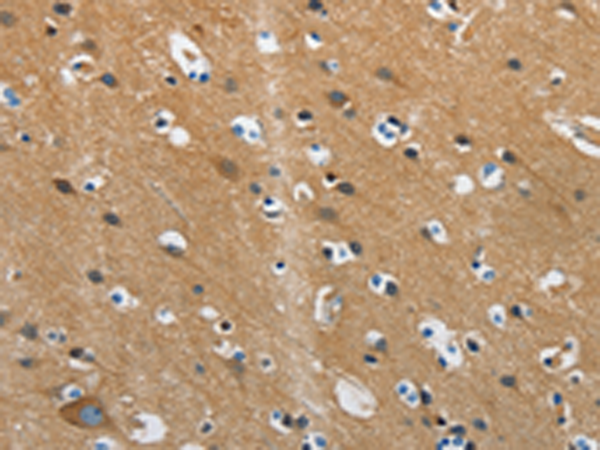 The image is immunohistochemistry of paraffin-embedded Human brain tissue using P11500(DDAH1 Antibody) at dilution 1/55. (Original magnification: ×200) |
