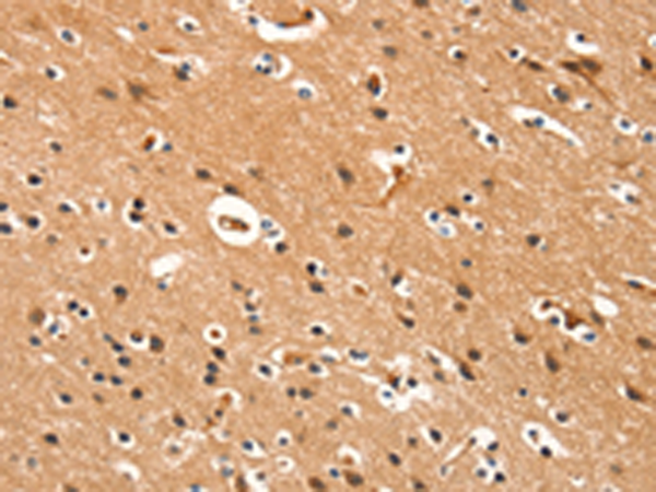 The image is immunohistochemistry of paraffin-embedded Human brain tissue using P11705(DDAH2 Antibody) at dilution 1/15. (Original magnification: ×200) |
