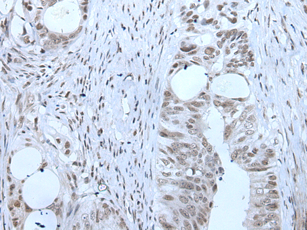 The image is immunohistochemistry of paraffin-embedded Human colorectal cancer tissue using P07247(DDB2 Antibody) at dilution 1/30. (Original magnification: ×200) |