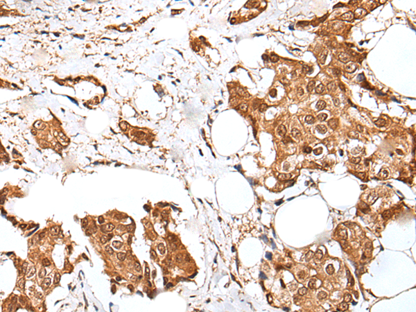 The image is immunohistochemistry of paraffin-embedded Human breast cancer tissue using P05768(DDIT3 Antibody) at dilution 1/30. (Original magnification: ×200) |