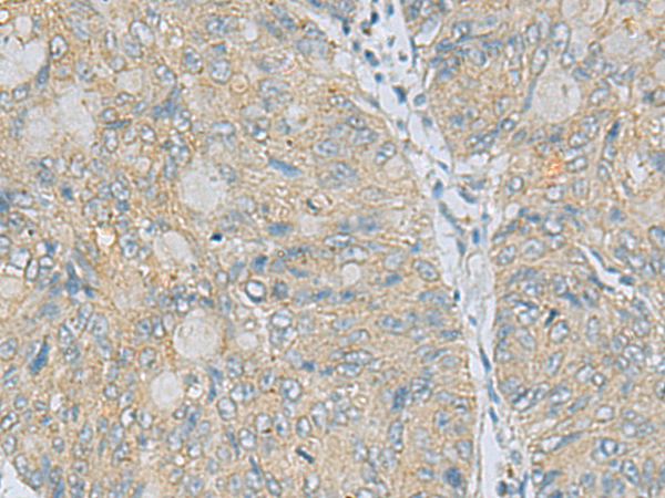 The image is immunohistochemistry of paraffin-embedded Human colorectal cancer tissue using P12514(DEFB1 Antibody) at dilution 1/20. (Original magnification: ×200) |