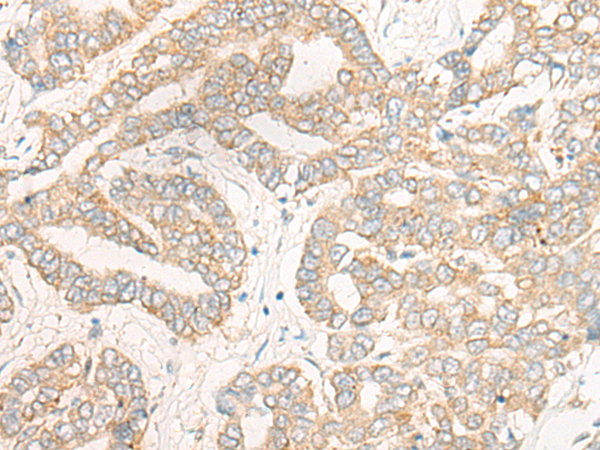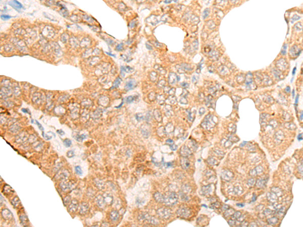 The image is immunohistochemistry of paraffin-embedded Human thyroid cancer tissue using P06374(DEPTOR Antibody) at dilution 1/20. (Original magnification: ×200) |