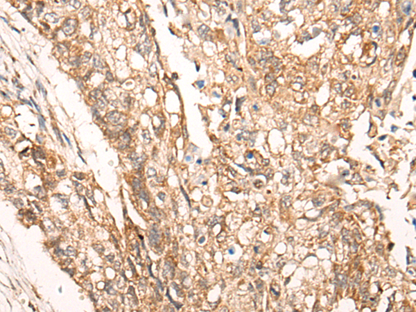 The image is immunohistochemistry of paraffin-embedded Human lung cancer tissue using P04640(DGKI Antibody) at dilution 1/25. (Original magnification: ×200) |
