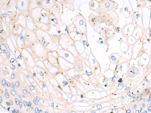 The image is immunohistochemistry of paraffin-embedded Human esophagus cancer tissue using P03596(DHTKD1 Antibody) at dilution 1/50. (Original magnification: ×200) |