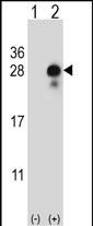 Western blot analysis of DLK2 (arrow) using rabbit polyclonal DLK2 Antibody (C-term) (Cat. #P30441). 293 cell lysates (2 ug/lane) either nontransfected (Lane 1) or transiently transfected (Lane 2) with the DLK2 gene. |