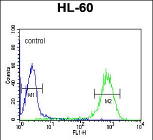 DLK2 Antibody (C-term) (Cat. #P30441) flow cytometric analysis of HL-60 cells (right histogram) compared to a negative control cell (left histogram).FITC-conjugated goat-anti-rabbit secondary antibodies were used for the analysis. |