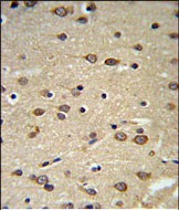DLK2 Antibody (C-term) (Cat. #P30441) IHC analysis in formalin fixed and paraffin embedded brain tissue followed by peroxidase conjugation of the secondary antibody and DAB staining. This data demonstrates the use of the DLK2 Antibody (C-term) for immunohistochemistry. Clinical relevance has not been evaluated. |