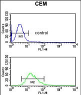 DMC1 Antibody (N-term) (Cat. #P30492) flow cytometric analysis of CEM cells (bottom histogram) compared to a negative control cell (top histogram).FITC-conjugated goat-anti-rabbit secondary antibodies were used for the analysis. |