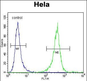DNAJB6 Antibody (Center) (Cat. #P31097) flow cytometric analysis of Hela cells (right histogram) compared to a negative control cell (left histogram).FITC-conjugated goat-anti-rabbit secondary antibodies were used for the analysis. |