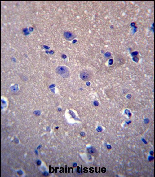 DNAJB6 Antibody (Center) (Cat. #P31097)immunohistochemistry analysis in formalin fixed and paraffin embedded human brain tissue followed by peroxidase conjugation of the secondary antibody and DAB staining.This data demonstrates the use of DNAJB6 Antibody (Center) for immunohistochemistry. Clinical relevance has not been evaluated. |
