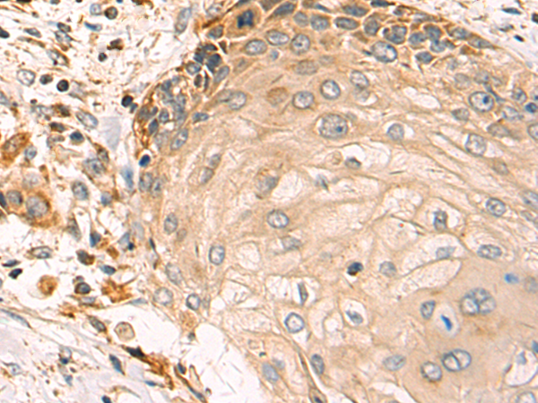 The image is immunohistochemistry of paraffin-embedded Human esophagus cancer tissue using P13279(DND1 Antibody) at dilution 1/20. (Original magnification: ×200) |