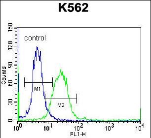 DOC2A Antibody (Center) (Cat. #P31171) flow cytometric analysis of K562 cells (right histogram) compared to a negative control cell (left histogram).FITC-conjugated donkey-anti-rabbit secondary antibodies were used for the analysis. |