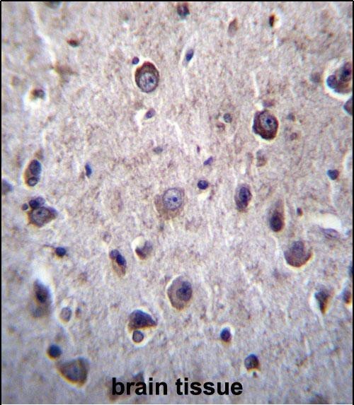 DOC2A Antibody (Center) (Cat. #P31171)immunohistochemistry analysis in formalin fixed and paraffin embedded human brain tissue followed by peroxidase conjugation of the secondary antibody and DAB staining.This data demonstrates the use of DOC2A Antibody (Center) for immunohistochemistry. Clinical relevance has not been evaluated. |