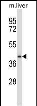 DPAGT1 Antibody (N-term) (Cat. #P31380) western blot analysis in mouse liver tissue lysates (35ug/lane).This demonstrates the DPAGT1 antibody detected the DPAGT1 protein (arrow). |