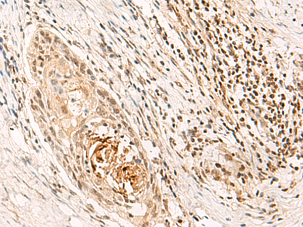 The image is immunohistochemistry of paraffin-embedded Human esophagus cancer tissue using P05754(DPPA4 Antibody) at dilution 1/45. (Original magnification: ×200) |