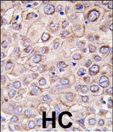 Formalin-fixed and paraffin-embedded human hepatocarcinoma tissue reacted with *DRAM antibody (N-term), which was peroxidase-conjugated to the secondary antibody, followed by DAB staining. This data demonstrates the use of this antibody for immunohistochemistry; clinical relevance has not been evaluated. |