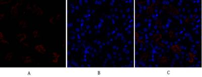 Immunofluorescence analysis of DRP1 in mouse kidney using DRP1 antibody(red),and DAPI (blue) |
